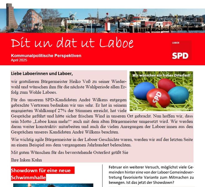 Mit den Osterferien haben auch wir eine kleine Pause von den Sitzungen der Ausschüsse und der Gemeindevertretung. Natürlich sind wir aber nicht untätig und verteilen nicht nur Ostereier, sondern auch eine neue Ausgabe "Dit und Dat". Diese findet ihr nun in euren Briefkästen, oder hier online.